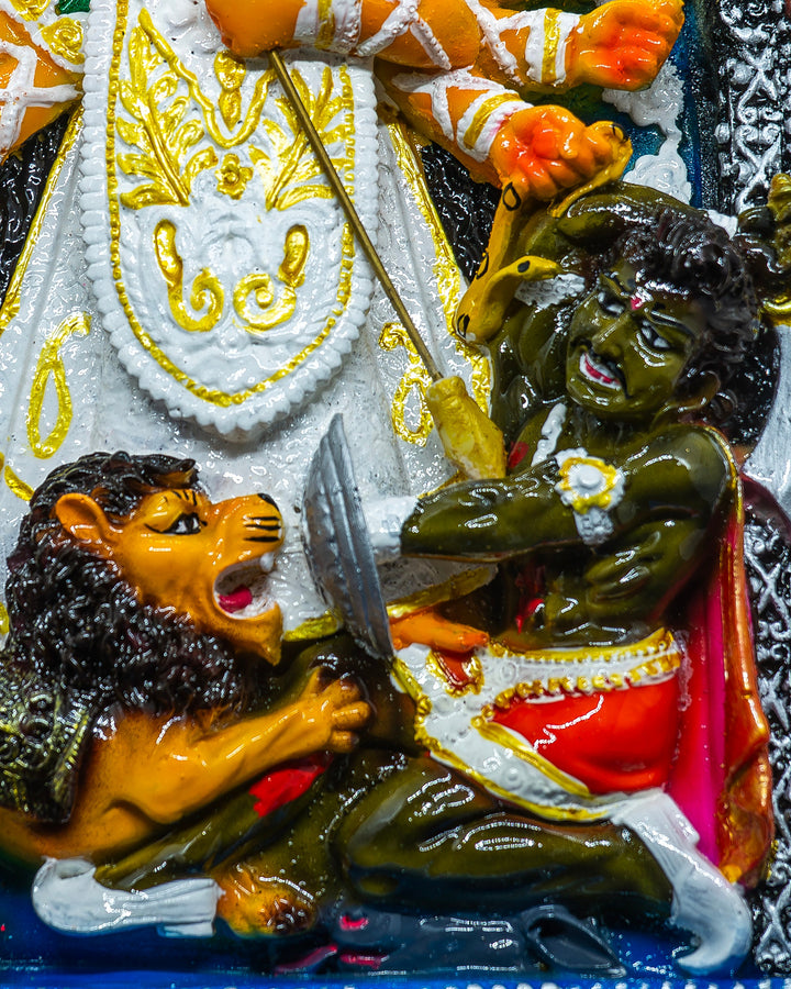 This marble stone statue of Hindu Goddess Durga maa is called Mahishasura Mardini, portrayed typically as a woman with ten weapons in her ten hands, killing a Demon called 'Mahishasura' to save the world as well as the haven from his tyranny. We could see her vahana Lion also in action.