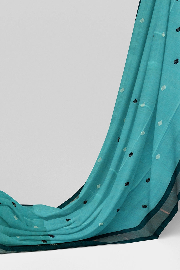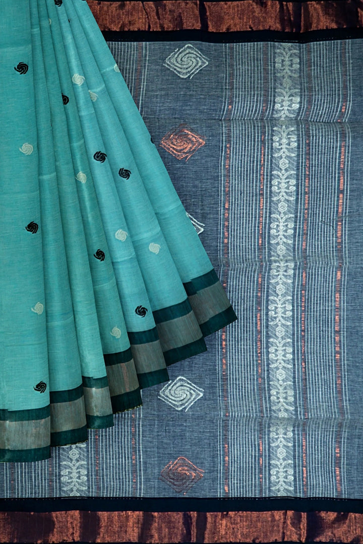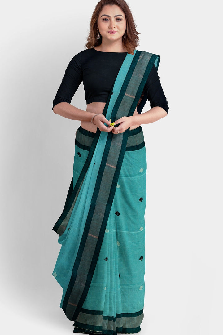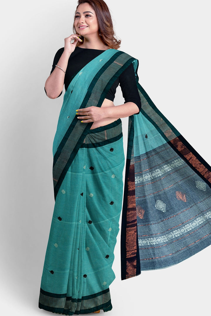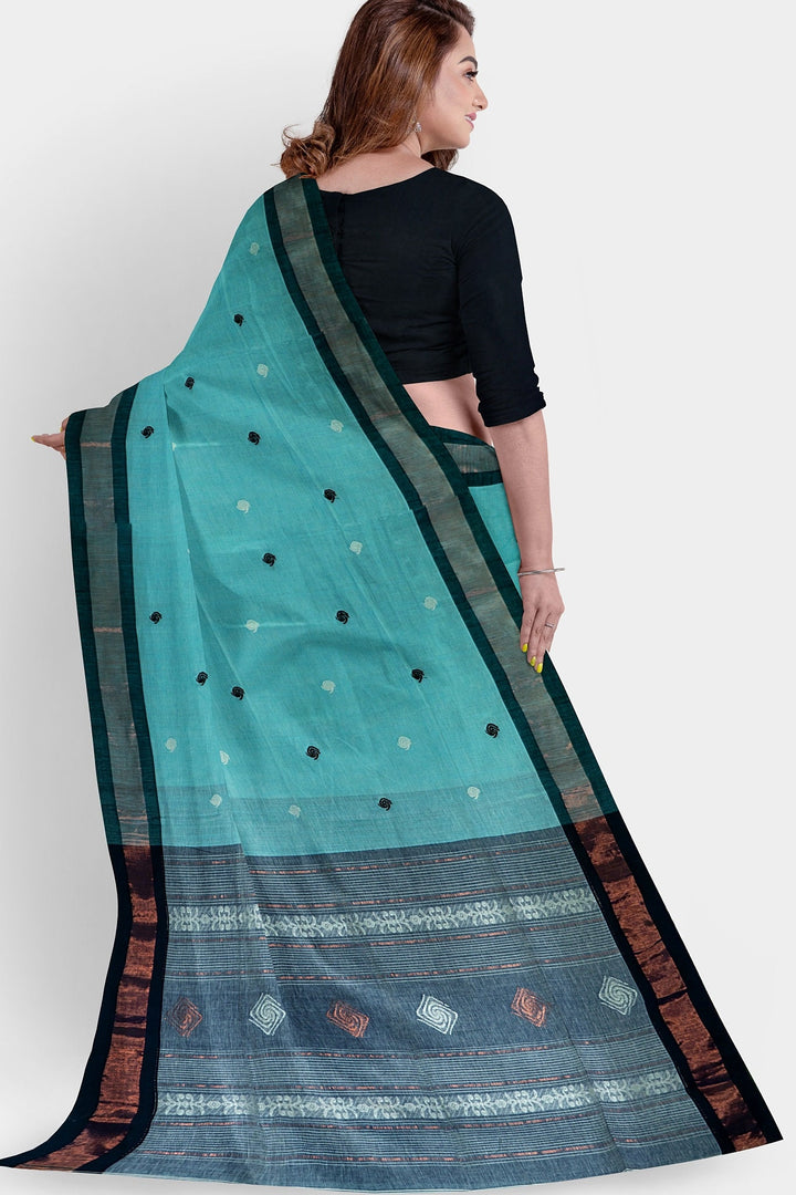 Bengali Handloom pure khadi cotton sky & black saree -Govt. of India certified handloom mark -Indian organic cotton sari blouse -MollisArts