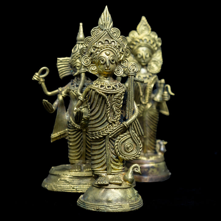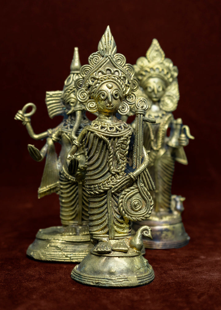 Dhokra Art - Indian brass statue of Lakshmi Ganesh Saraswati - Primitive Indian folk art- A vintage Indian art form - by mollisarts