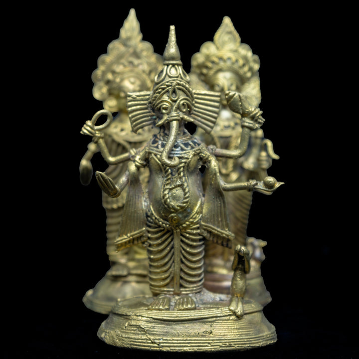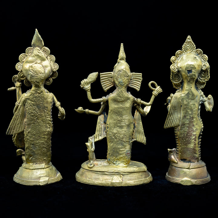 This Art Collectible: This set of Lakshmi, Ganesh, and Saraswati murti is a primitive dokra handicraft from India. Dokra or Dhokra is an ancient Indian brass art and craft which has been living through over 4000 years. This art form was started back in the period of one of the oldest societies, Mohenjo- daro. The simplicity of this primitive Indian craft has always attracted people. Dokra is principally a non-ferrous ornon-iron grounded casting of essence using lost- wax casting. Dokra is a very rarely found and high demand craft now a days. To know the full story , please visit our website mollisarts.