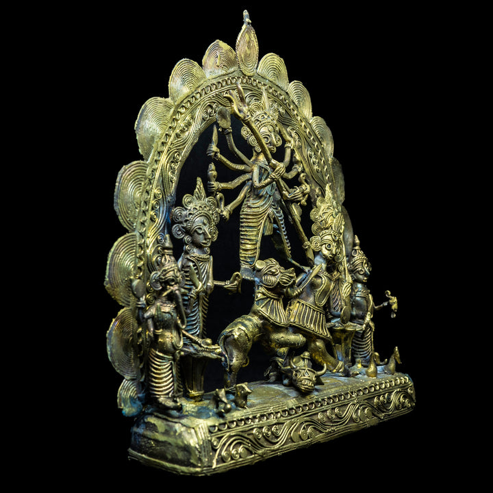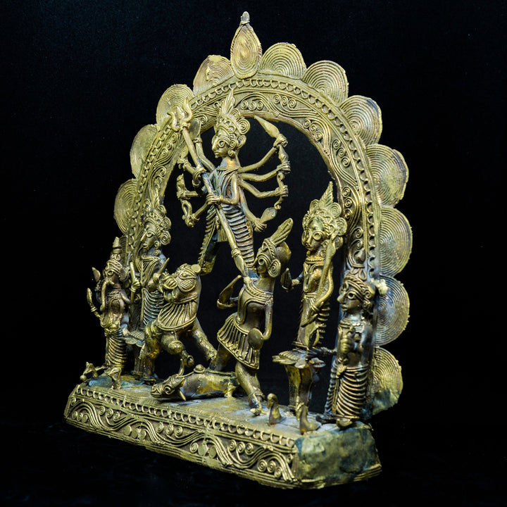 This Dhokra statue of the goddess Durga with her family is called Mahishasura Mardini, portrayed typically as a woman with ten weapons in her ten hands, killing a Demon called 'Mahishasura' to save the world as well as the haven from his tyranny. We could see her vahana Lion also in action.