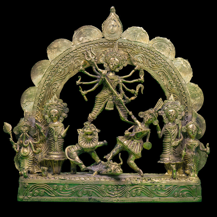 About This Collectible: This is a dokra crafted maa Durga brass figurine. Dokra or Dhokra is an ancient Indian brass art and tribal craft which has been living through over 4000 years. This art form was started back in the period of one of the oldest societies, Mohenjo- daro. The simplicity of this primitive Indian handicraf has always attracted people. Dokra is principally a non-ferrous ornon-iron grounded casting of essence using lost- wax casting.