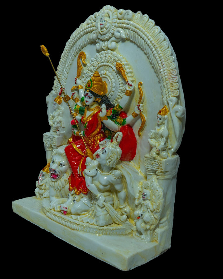 This marble stone statue of Hindu Goddess Durga maa is called Mahishasura Mardini, portrayed typically as a woman with ten weapons in her ten hands, killing a Demon called 'Mahishasura' to save the world as well as the haven from his tyranny. We could see her vahana Lion also in action.