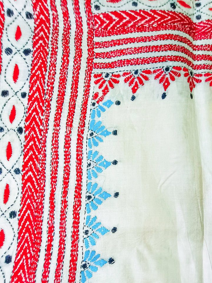 Kantha Stitch, an ancient art from Bengal, involves embroidering intricate patterns on old fabrics. Initially, it served to repurpose and mend textiles, later becoming a decorative art form reflecting the region's cultural heritage. Kantha stich got GI Tag from Govt. of India on 15th March 2021.