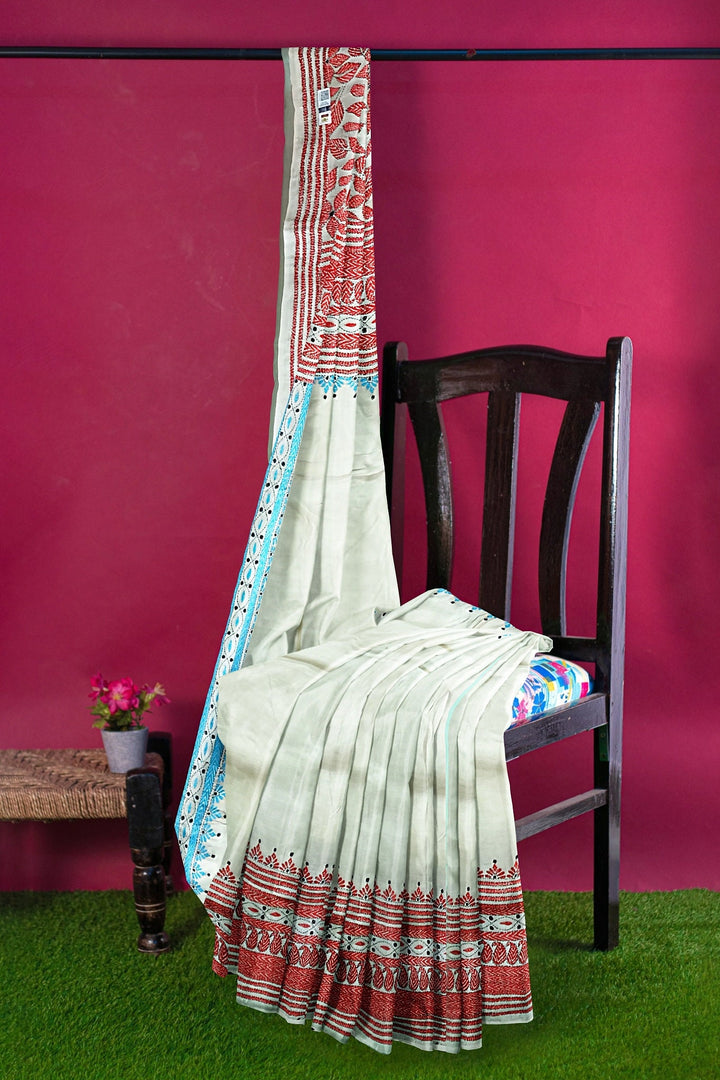 Govt of India silk mark -Bengali Handloom kantha stich on tussar silk sari with readymade blouse -Indian Pure Silk Durga Puja saree