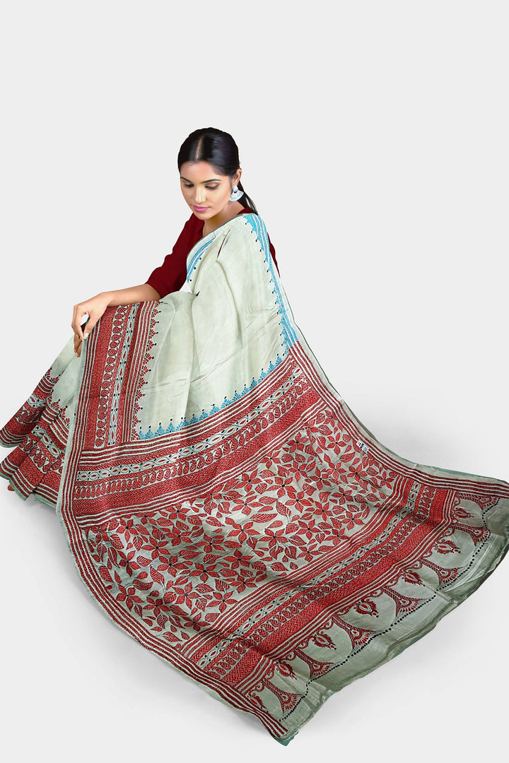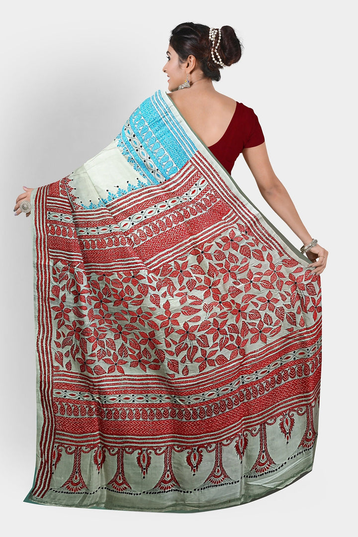 Indulge in luxury with our pure Tussar silk featuring exquisite all-over Kantha stitching in radiant red, complemented by serene sky-blue floral motifs. A harmonious blend of artistry and elegance for your wardrobe.
