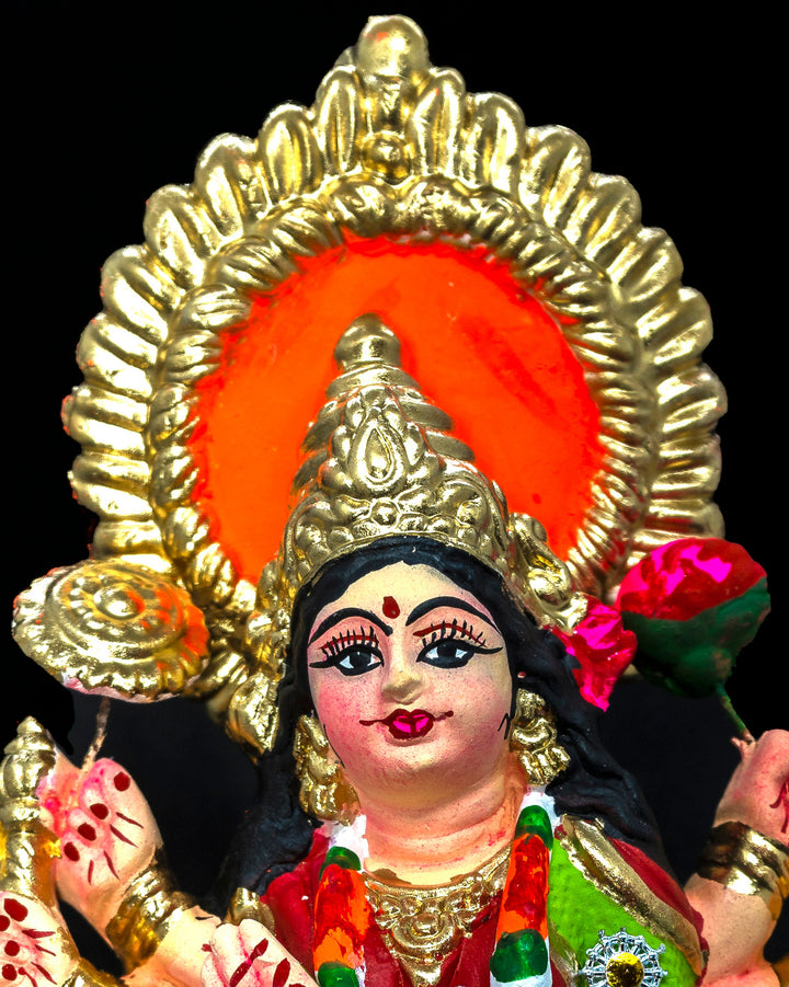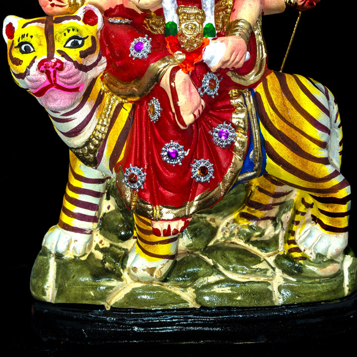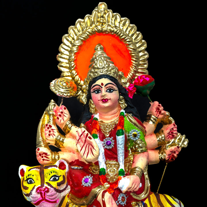 This Art Collectible: This Mata rani Durga ma Idol is made from Holy Ganges Clay, handcrafted and hand-painted. For longevity those craft items are burnt in a specific temperature and the selection of clay mud is also important, mostly collected from river beds. Each river has its unique soil and requires special care and processing, then only the final product becomes a signature and of course the cultural uniqueness is also prominent in each Indian folk art piece.