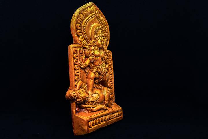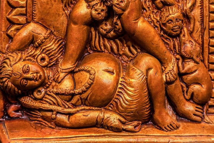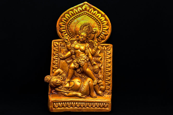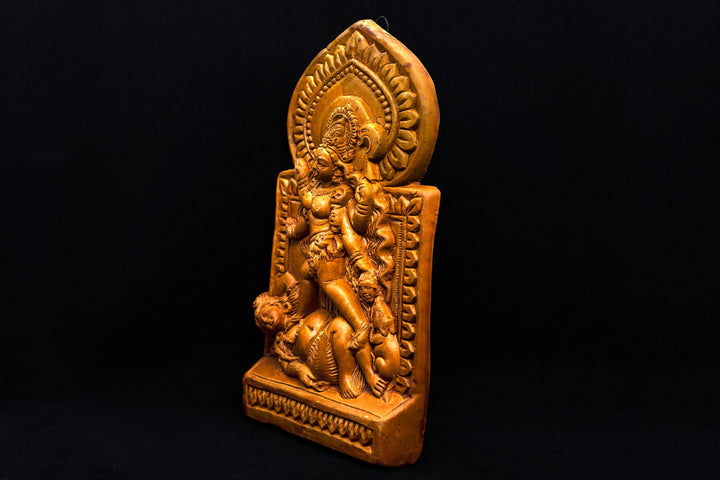 This Art Collectible: This goddess statue of divine mother Kali standing on lord Shiva is made from Holy Ganges Clay, handcrafted and hand-painted. For longevity those craft items are burnt in a specific temperature and the selection of clay mud is also important, mostly collected from river beds. Each river has its unique soil and requires special care and processing, then only the final product becomes a signature and of course the cultural uniqueness is also prominent in each Indian folk art piece.