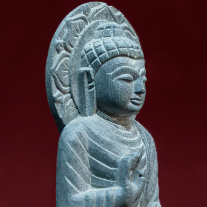 This stone buddha sculpture is hand crafted from a single stone with some basic and traditional tool kits. While visiting a historic town situated in South India we learned this Vintage art form.