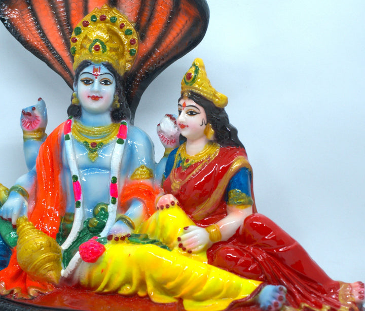 In the cosmic serenity of Ananta Shesha, Vishnu, the preserver, reclines gracefully with Lakshmi by his side as Lakshmi Narayan. Ananta, the infinite serpent, forms their divine bed. Vishnu, the benevolent deity, embodies cosmic harmony, while Lakshmi, the goddess of wealth and prosperity, represents abundance. As they repose atop Ananta, they symbolize the eternal cycle of creation, preservation, and dissolution. Vishnu's serene presence and Lakshmi's nurturing energy within Ananta's coils encapsulate the timeless essence of their union, radiating tranquility and abundance across the cosmos.