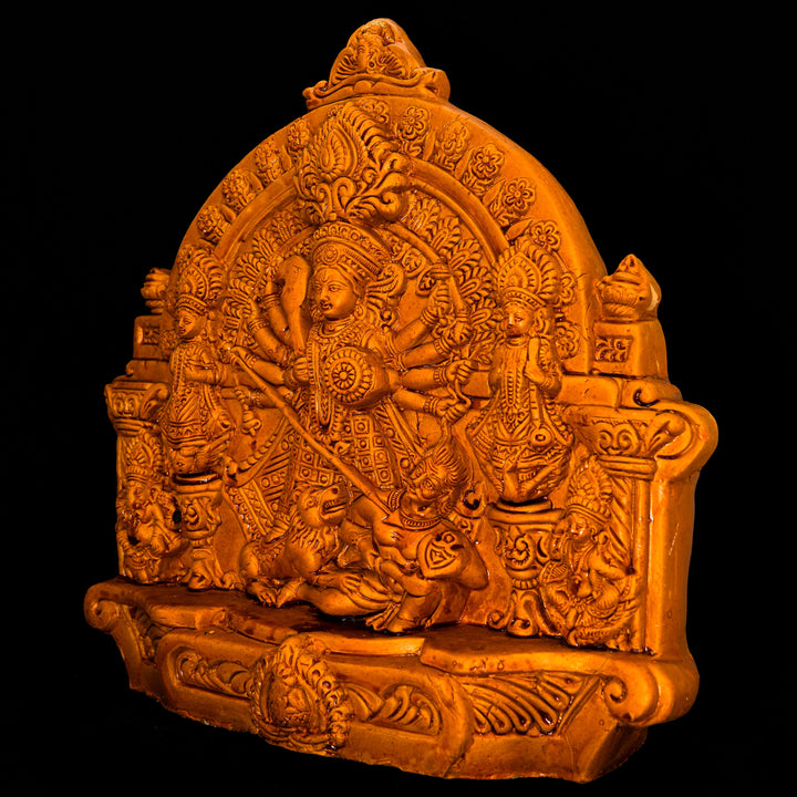 This Art Collectible: This Mahishasura Mardini Traditional Durga Statue is a primitive terracotta handicraft from India. For longevity those craft items are burnt in a specific temperature and the selection of clay mud is also important, mostly collected from river beds. Each river has its unique soil and requires special care and processing, then only the final product becomes a signature and of course the cultural uniqueness is also prominent in each Indian folk art piece.