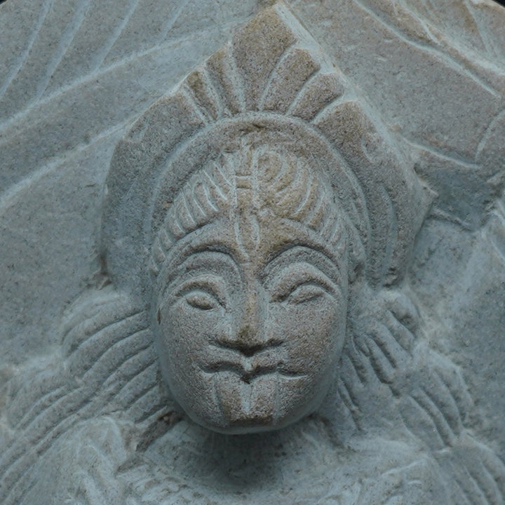 • One hand bearing diversely a Khadga and another hand bearing a severed human-head. The sword signifies divine wisdom and the human head signifies mortal pride which must be slain by holy knowledge in order to achieve moksha(enlighten).