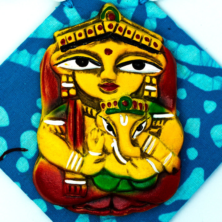 This Terracotta Temple jewelry portrays goddess Durga with her son Ganesha called Ganesh Janani (mother of Ganesh)